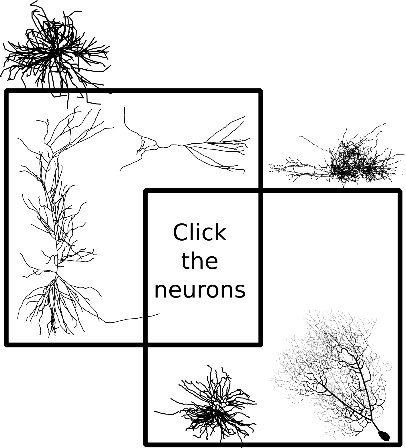 With the exception of the Purkinje cell, the neurons are representations of actual, once-living cells traced by many scientific researchers and shared publicly on NeuroMorpho.Org: